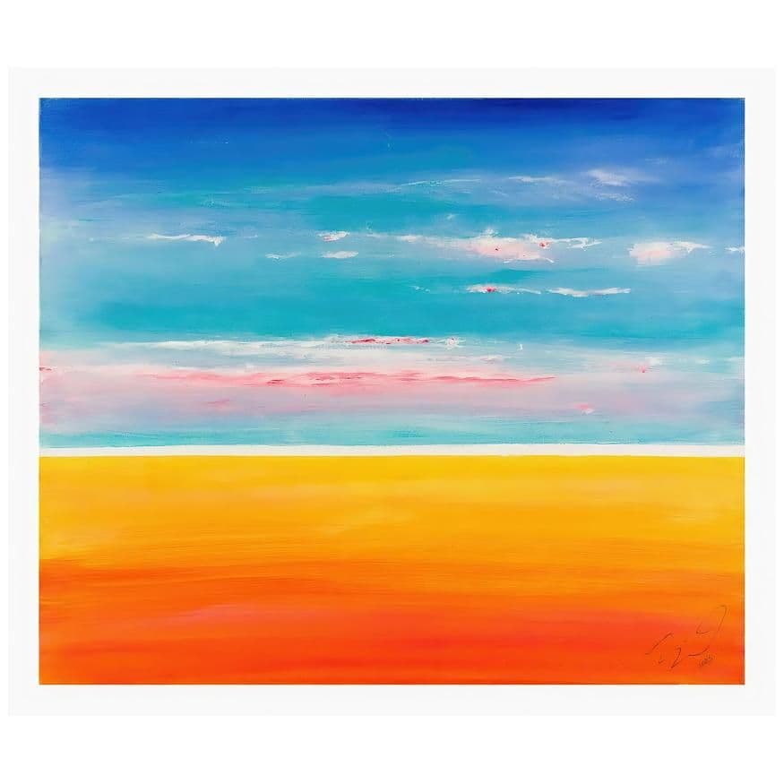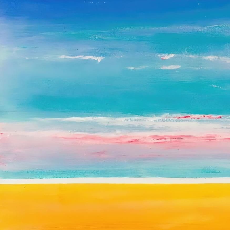 The image is taken from an original acrylic painting by the artist in which the viewer is invited, as if in a daydream, to fill in the details within their mind to this delightfully undefined scene. Try adding a boat to the horizon perhaps or maybe walkers on the beach, for this is a place for quiet reverie, a space to breathe, to wander, to dream.