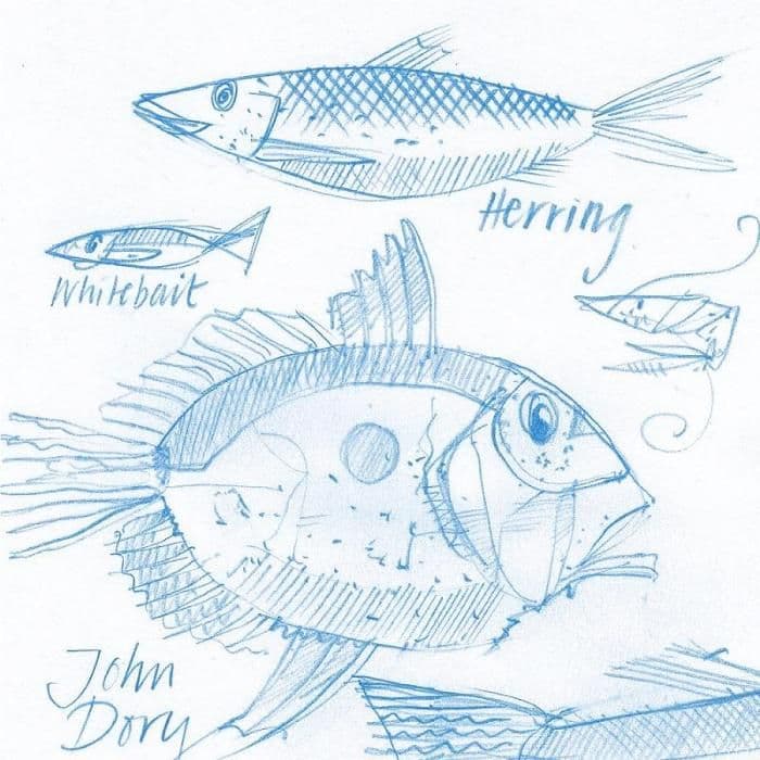 Inspired by the coast he depicts fish, sea life and seafood’s, together with colourful images of maps, coastal towns and villages. He is happy to do commissions.