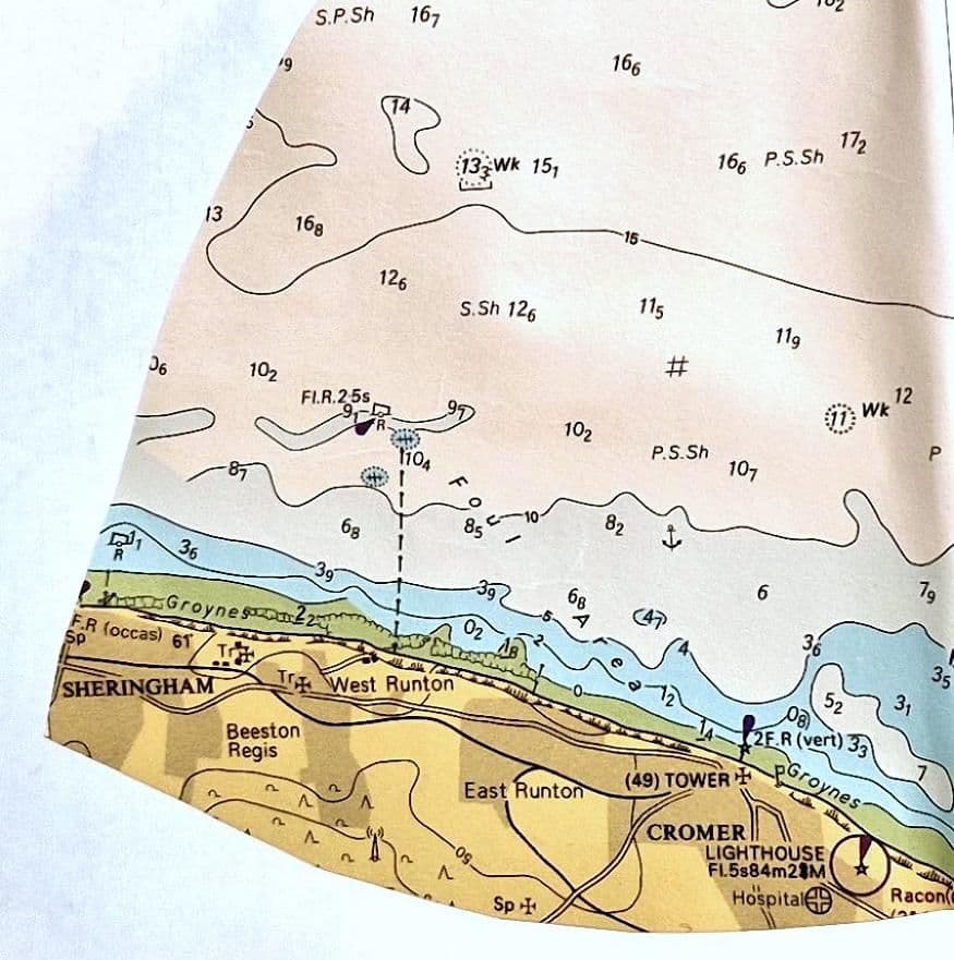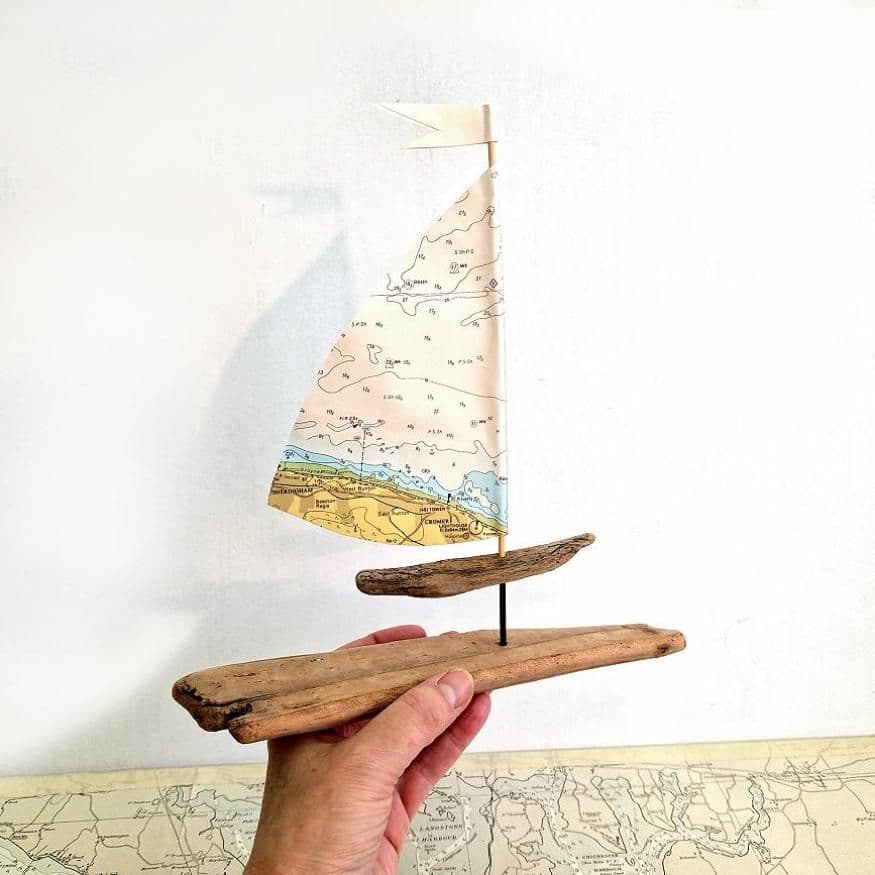 Cleverly handmade by Rachel White, this particular sailboat uses a map featuring the waters around Sheringham and Cromer in Norfolk.