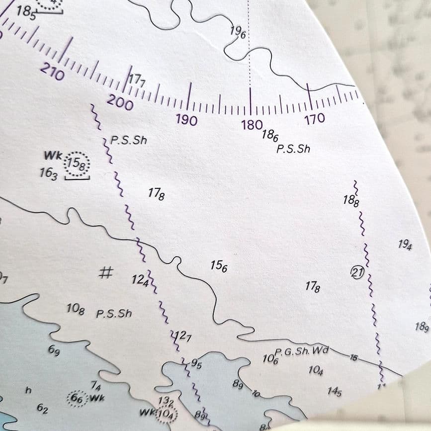 The sail may have handwritten annotations from actual voyages plotted on the chart and would have been originally used onboard for navigation on voyages around the British Isles. You can almost hear the whoosh and flapping of sails and the tinkling sound of spinnakers on mast.