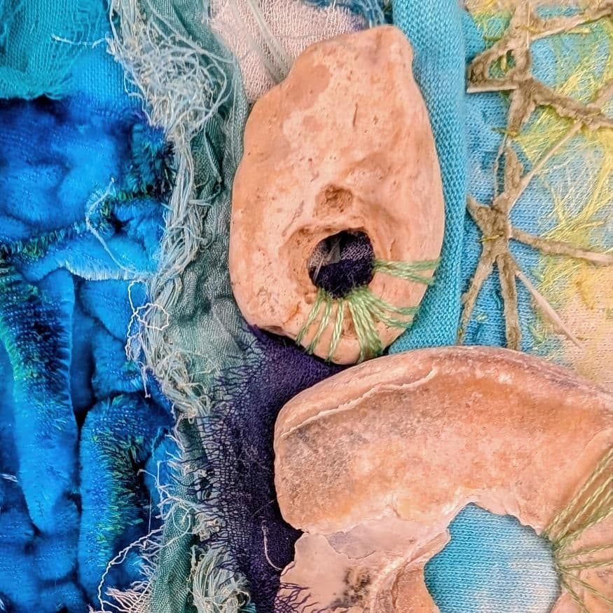 Titled ‘Echo Nautica IV’ this textile artwork by Lucinda Button forms part of a series that reflects her practice of transforming repurposed fabrics and discarded materials, interwoven with beach detritus,both natural and human-made.