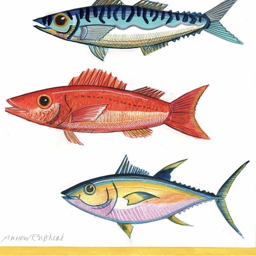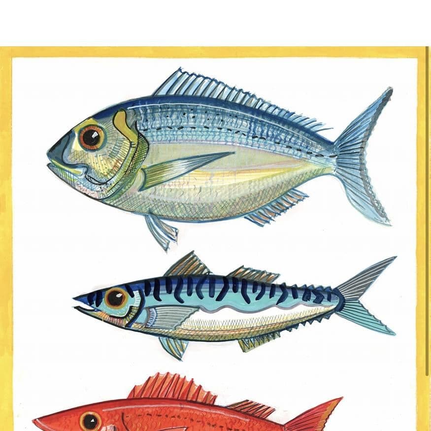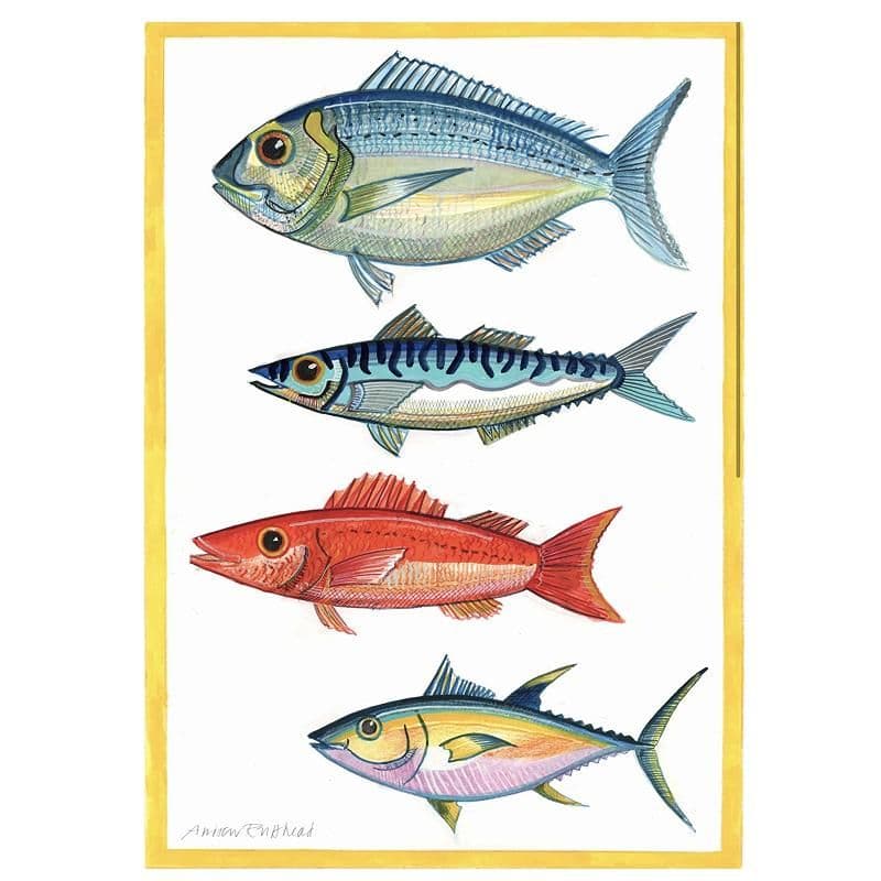 Simply entitled ‘Four Fish with Yellow Border’ this vibrant celebration of coastal life, blends vintage naturalist illustration with a fresh, modern finish.