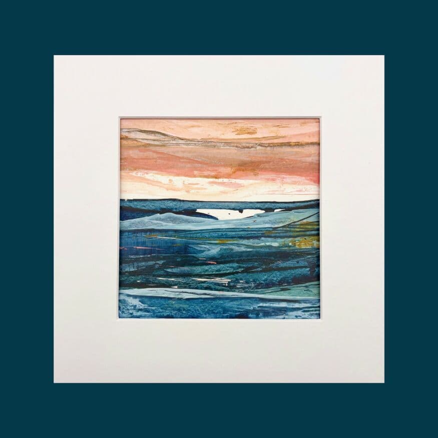 Simply entitled ‘Just Peachy’ this is another in the Peach Skies collection of original semi abstract seascape painting by Louise Levine inspired by that wonderful feeling when the sun sets, igniting the sky with beautiful peach hues, making it feel like everything is right in the world in that moment.