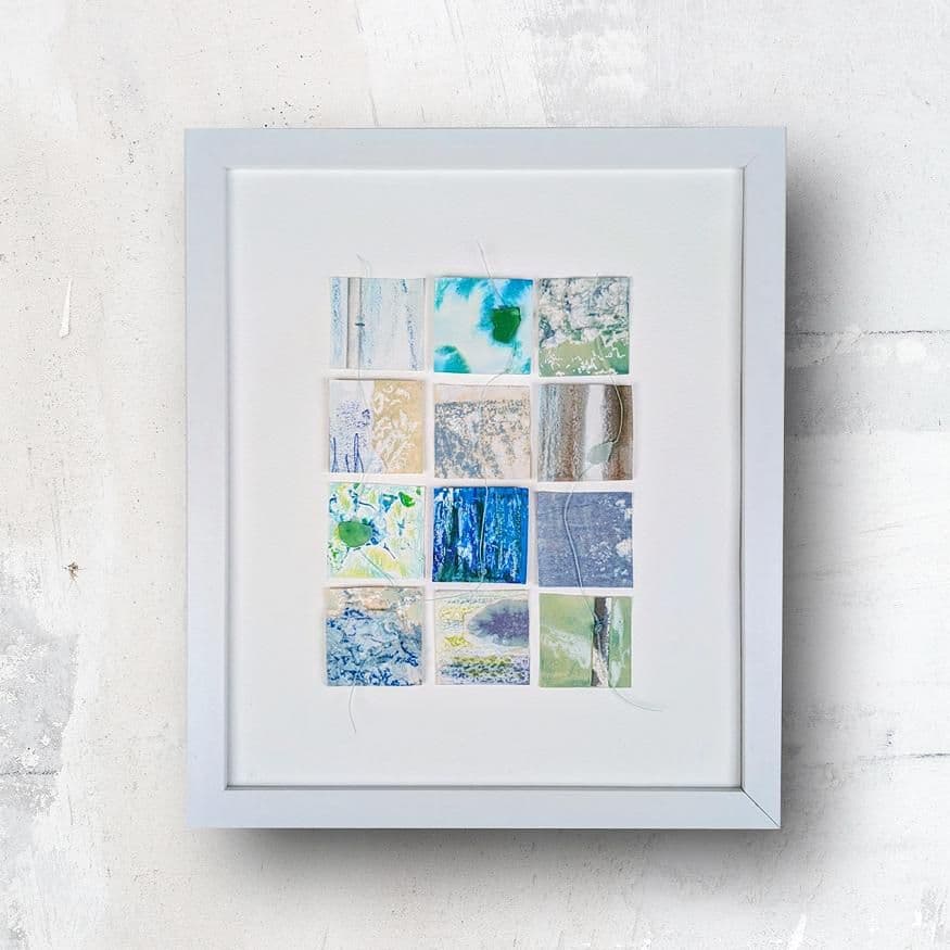 Simply entitled ‘Rough 12 Wave Forms’ the piece by Lucinda Button is born from transformation. Crafted using papers left behind from dyeing processes, each miniature abstract composition is enriched with layers of mixed media.