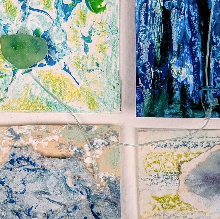Connected with found fishing line and accented by sea glass, these gem-like squares celebrate colour and texture in unexpected ways. By reimagining what others might see as discarded materials, The Wave highlights the intricate and often fragile relationship we share with the sea, turning remnants into treasures.