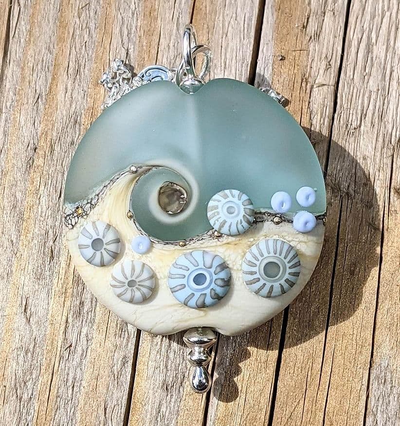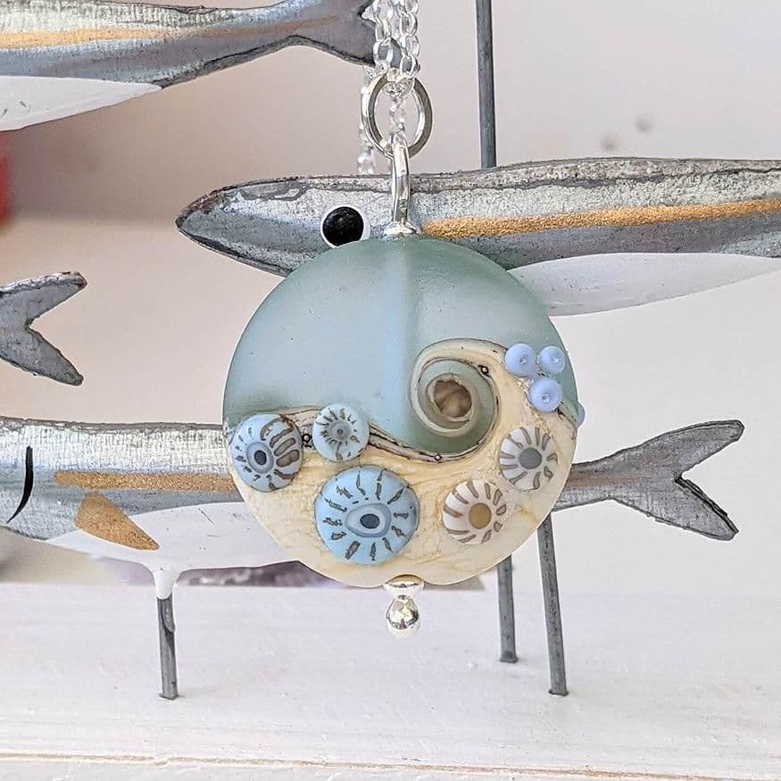 Inspired by everything coastal, this beautiful Sea Spray glass pendant necklace displays a richly decorated surface.