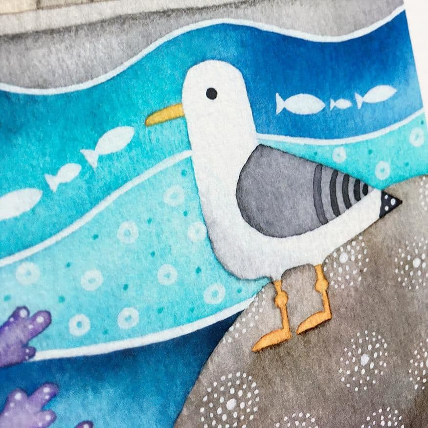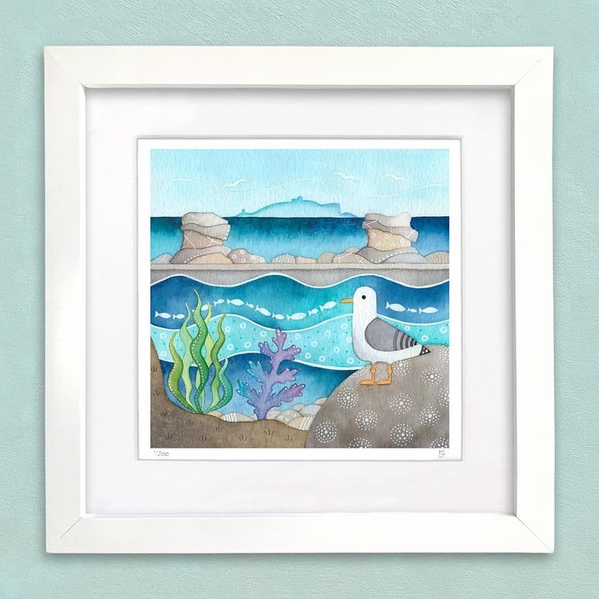 This colourful limited edition art print by Louise Stocker depicts a little seagull perched on the rocks at Cellardyke bathing pool.