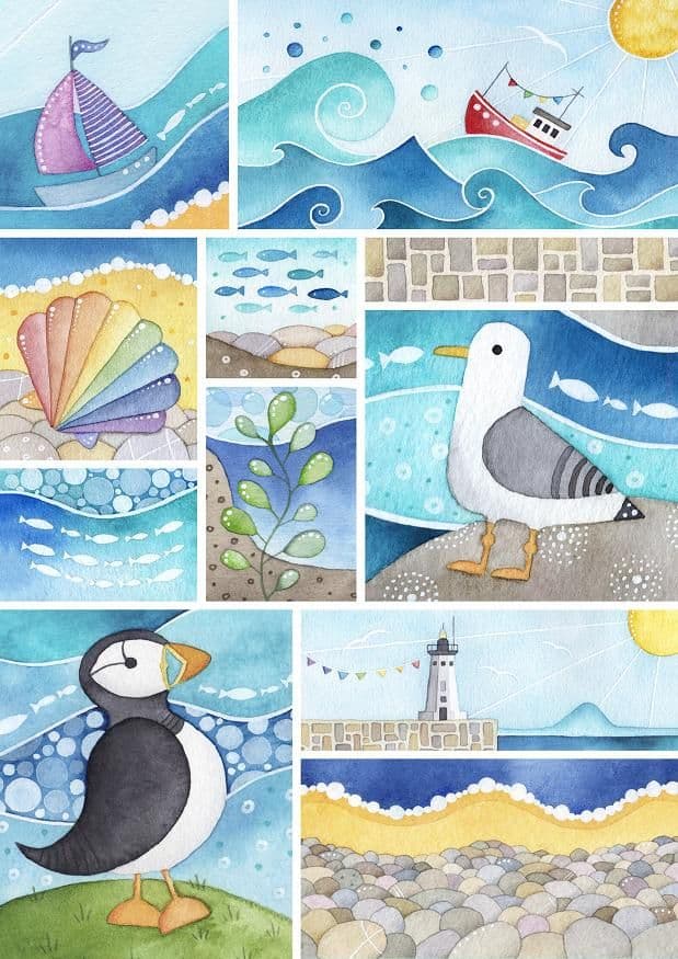 I love to capture the joy of the Scottish seaside, our beautiful beaches and local wildlife in a fun and cheerful style. The original paintings were produced using a blend of watercolour, ink and pencil.