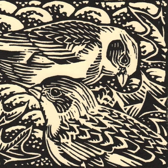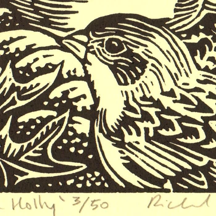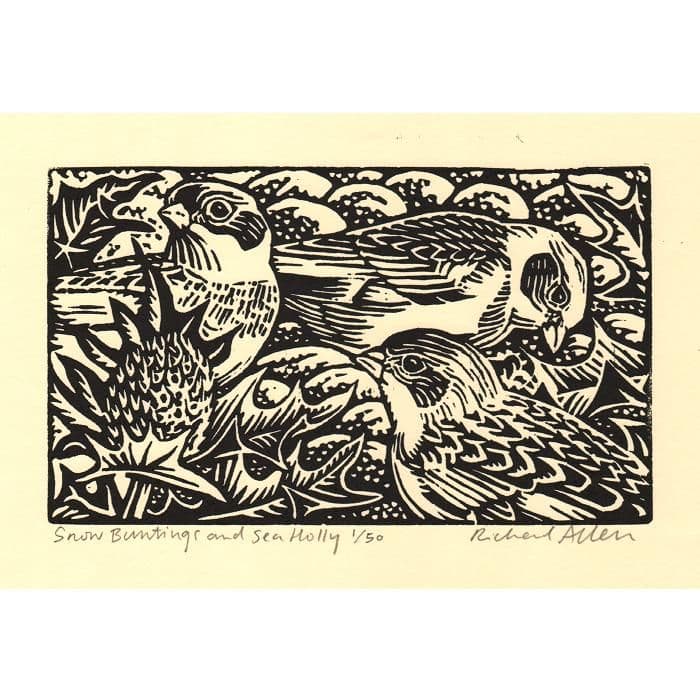 An original limited edition linocut print depicting Snow Buntings and Sea Holly by Richard Allen.