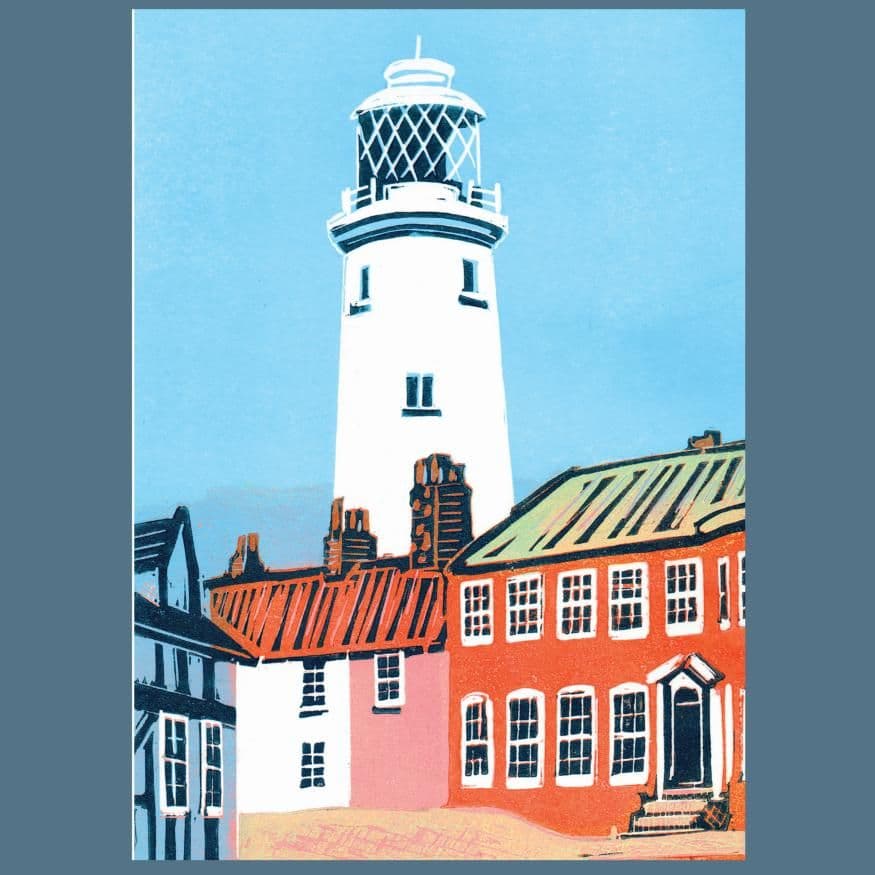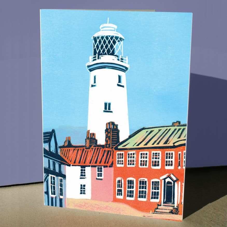 This lovely coastal card features an image of Southwold Lighthouse peeking out above the houses and is based on an original linocut print by artist Fiona Horan.
