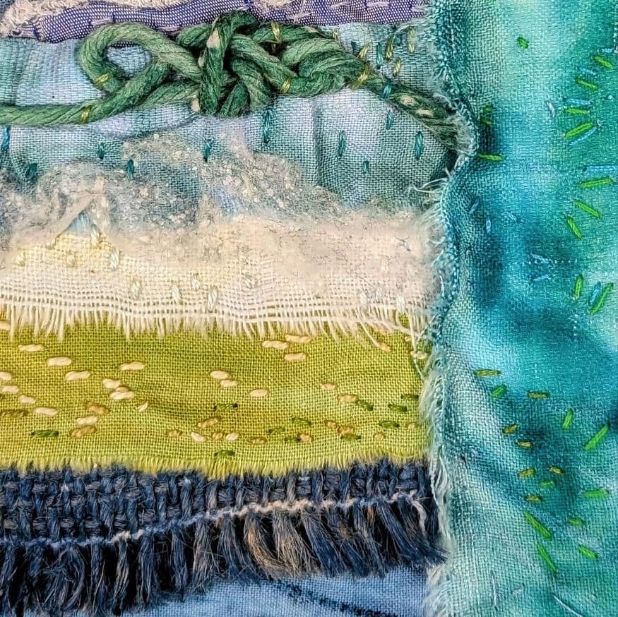 Repurposed fabrics are often dyed or mono-printed before being bound together through hours of hand embroidery. This slow, deliberate act of stitching has become essential to my own well-being, anchoring me in the present, easing life’s pressures, and offering a calming balance against daily stresses.