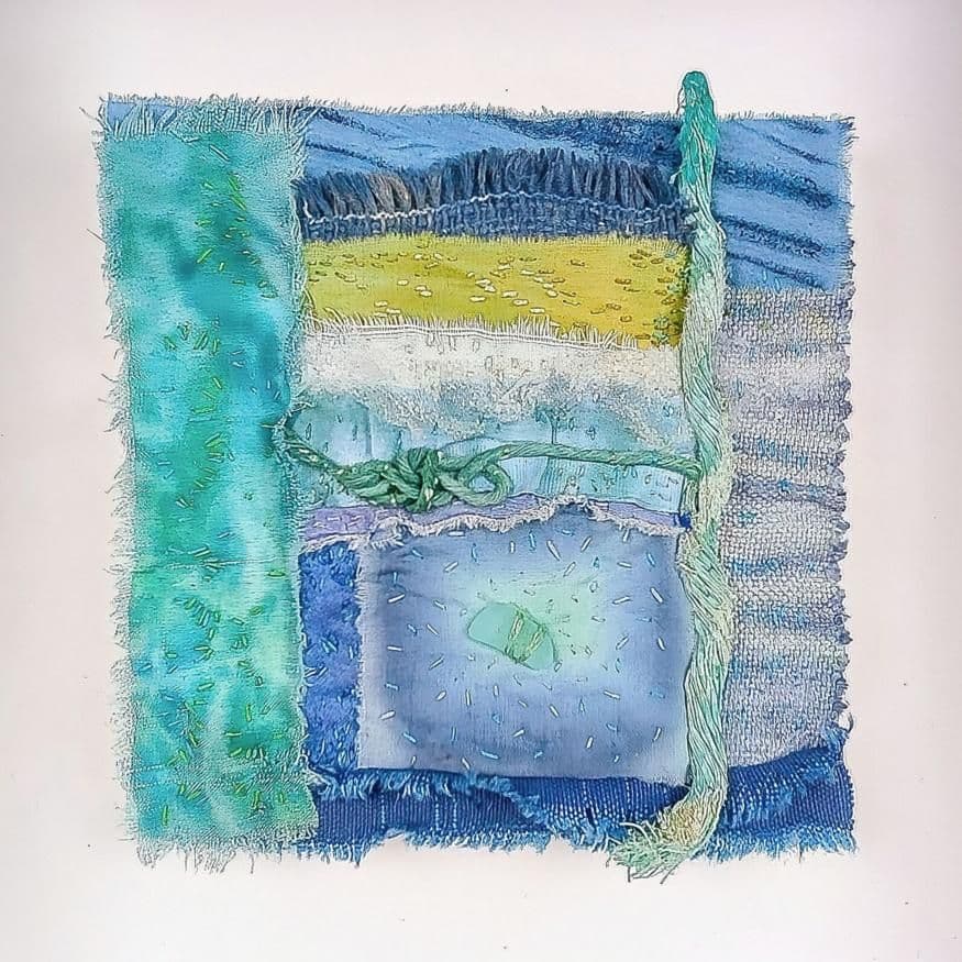These abstract impressions of the sea can be viewed in any orientation, though she presents them in the way that feels most resonant to her. Through hand embroidery she binds together the often-dyed fabrics, capturing the shifting moods and many faces of the ocean.